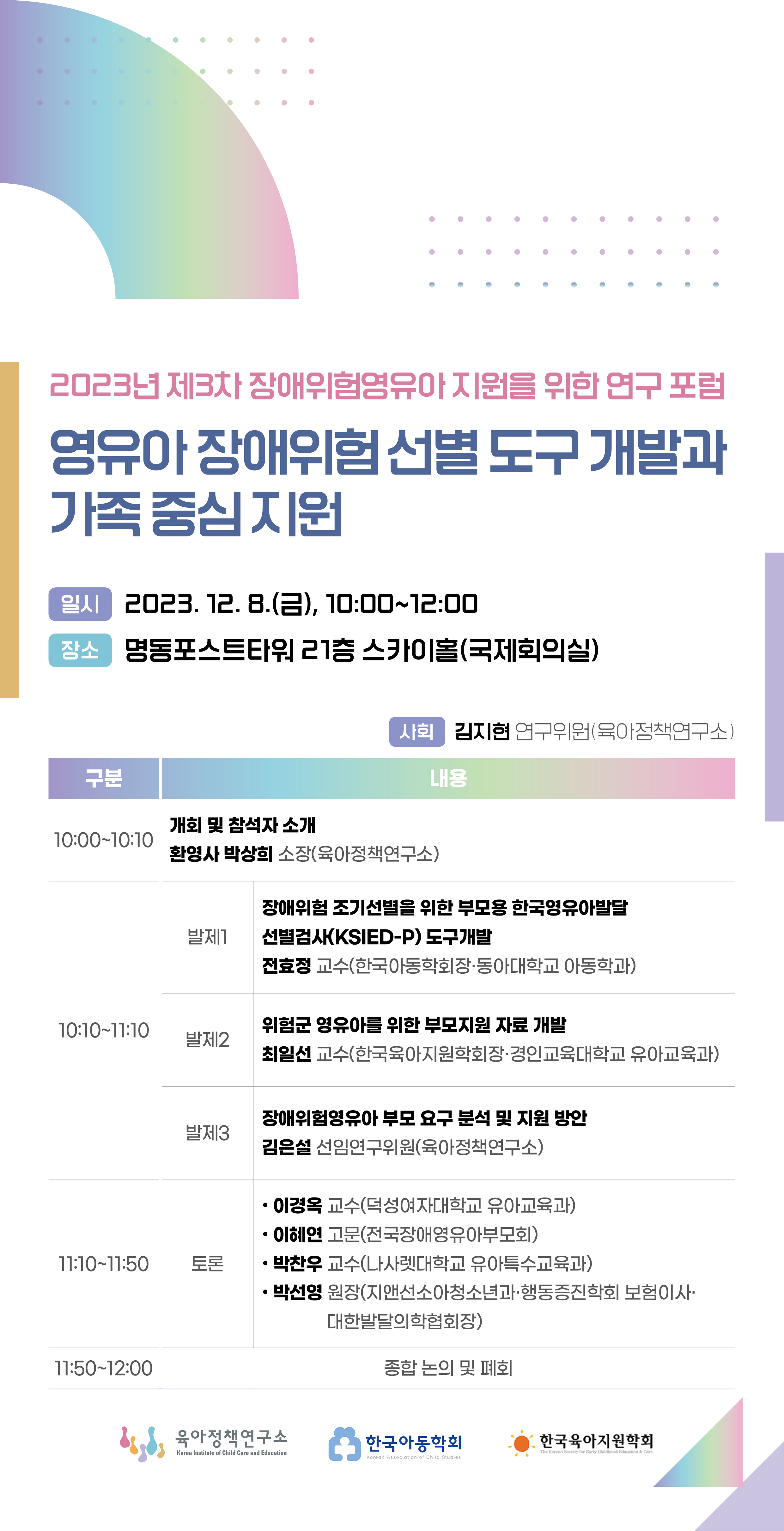 육아정책연구소 제3차 장애위험영유아 지원을 위한 연구 포럼 개최 안내